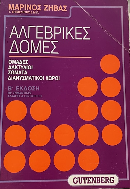 ΑΛΓΕΒΡΙΚΕΣ ΔΟΜΕΣ ΟΜΑΔΕΣ ΔΑΚΤΥΛΙΟΙ ΣΩΜΑΤΑ ΔΙΑΝΥΣΜΑΤΙΚΟΙ ΧΩΡΟΙ (44.869Α)Συγγραφέας: ΖΗΒΑΣ ΜΑΡΙΝΟΣ