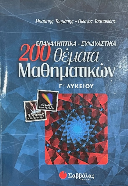 200 ΘΕΜΑΤΑ ΜΑΘΗΜΑΤΙΚΩΝ Γ΄ΛΥΛΕΙΟΥ ΕΠΑΝΑΛΗΠΤΙΚΑ ΣΥΝΔΥΑΣΤΙΚΑ (75.119Α)Συγγραφέας: ΤΟΥΜΑΣΗΣ ΜΠΑΜΠΗΣ - ΤΣΑΠΑΚΙΔΗΣ ΓΙΩΡΓΟΣ