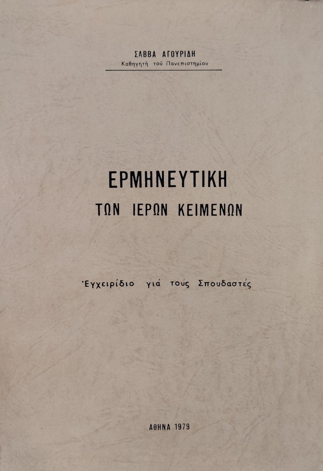 ΕΡΜΗΝΕΥΤΙΚΗ ΤΩΝ ΙΕΡΩΝ ΚΕΙΜΕΝΩΝ ΕΓΧΕΙΡΙΔΙΟ ΓΙΑ ΤΟΥΣ ΣΠΟΥΔΑΣΤΕΣ (75.970Ε)Συγγραφέας: ΑΓΟΥΡΙΔΗΣ Χ. ΣΑΒΒΑΣ
